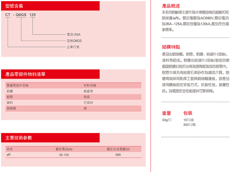 本系列熔斷器主要作為半導體設備的超載和短路保護(aR)。額定電壓為AC690V,額定電流為35A-125A,額定容量為120kA,產品符合國家標準。