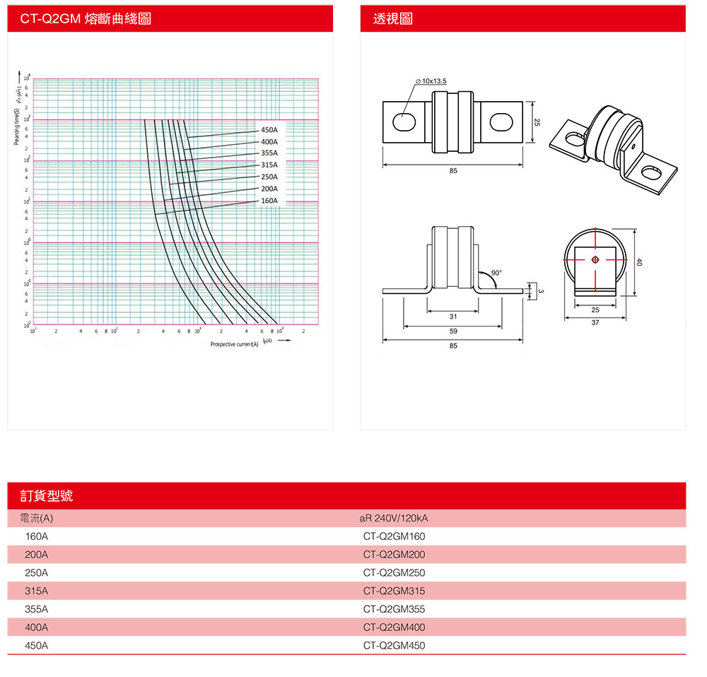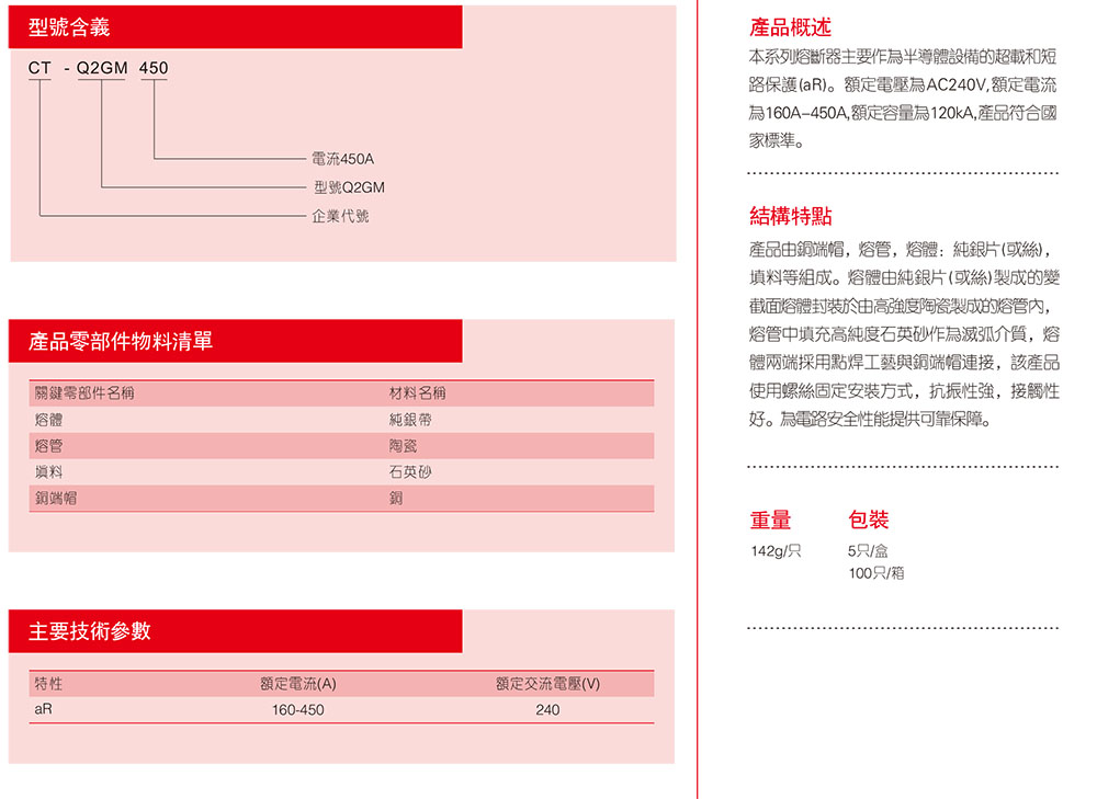 本系列熔斷器主要作為半導體設備的超載和短路保護(aR)。額定電壓為AC240V,額定電流為160A-450A,額定容量為120kA,產品符合國家標準。