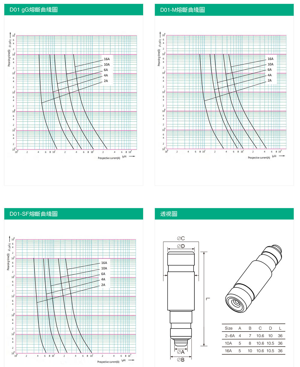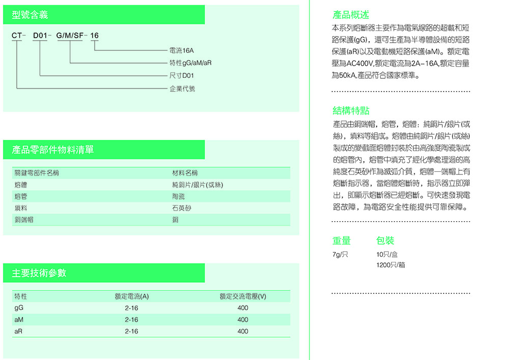 本系列熔斷器主要作為電氣線路的超載和短路保護(gG),還可生產為半導體設備的短路保護(aR)以及電動機短路保護(aM)。額定電壓為AC400V,額定電流為2A-16A,額定容量為50kA,產品符合國家標準。