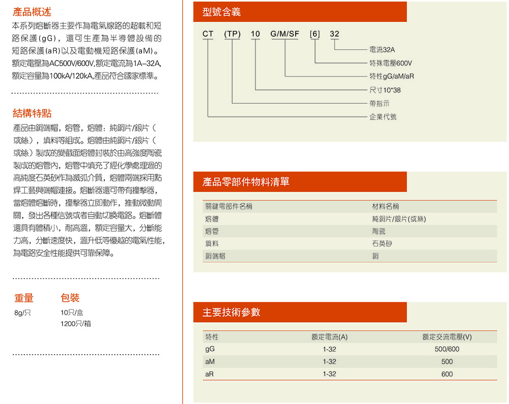本系列熔斷器主要作為電氣線路的超載和短路保護 (gG) ,還可生產為半導體設備的短路保護(aR)以及電動機短路保護(aM)。額定電壓為AC500V/600V,額定電流為1A-32A,額定容量為100kA/120kA,產品符合國家標準。