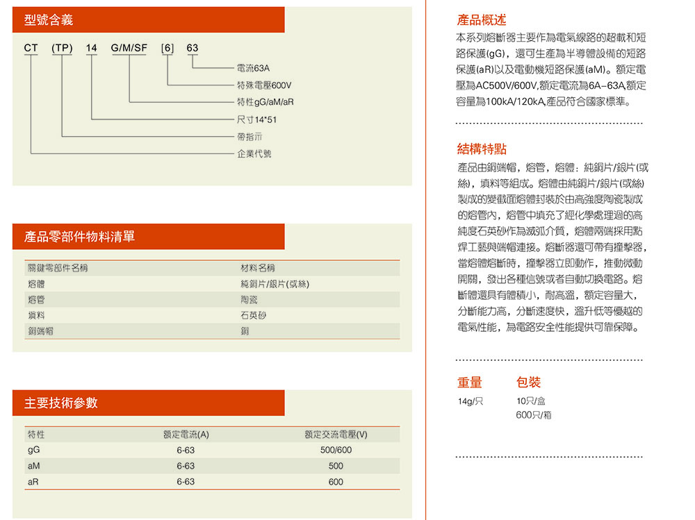 本系列熔斷器主要作為電氣線路的超載和短路保護(gG),還可生產為半導體設備的短路保護(aR)以及電動機短路保護(aM)。額定電壓為AC500V/600V,額定電流為6A-63A,額定容量為100kA/120kA,產品符合國家標準。