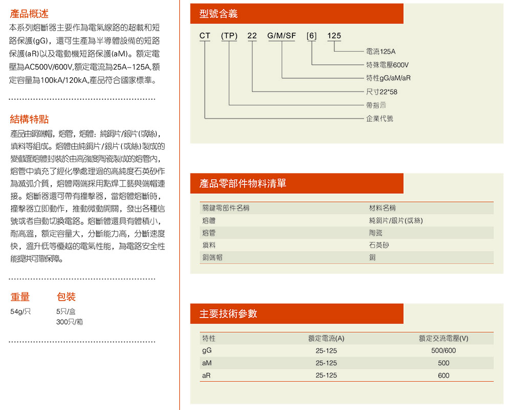 本系列熔斷器主要作為電氣線(xiàn)路的超載和短路保護(hù)(gG),還可生產(chǎn)為半導(dǎo)體設(shè)備的短路保護(hù)(aR)以及電動(dòng)機(jī)短路保護(hù)(aM)。額定電壓為AC500V/600V,額定電流為25A-125A,額定容量為100kA/120kA,產(chǎn)品符合國(guó)家標(biāo)準(zhǔn)