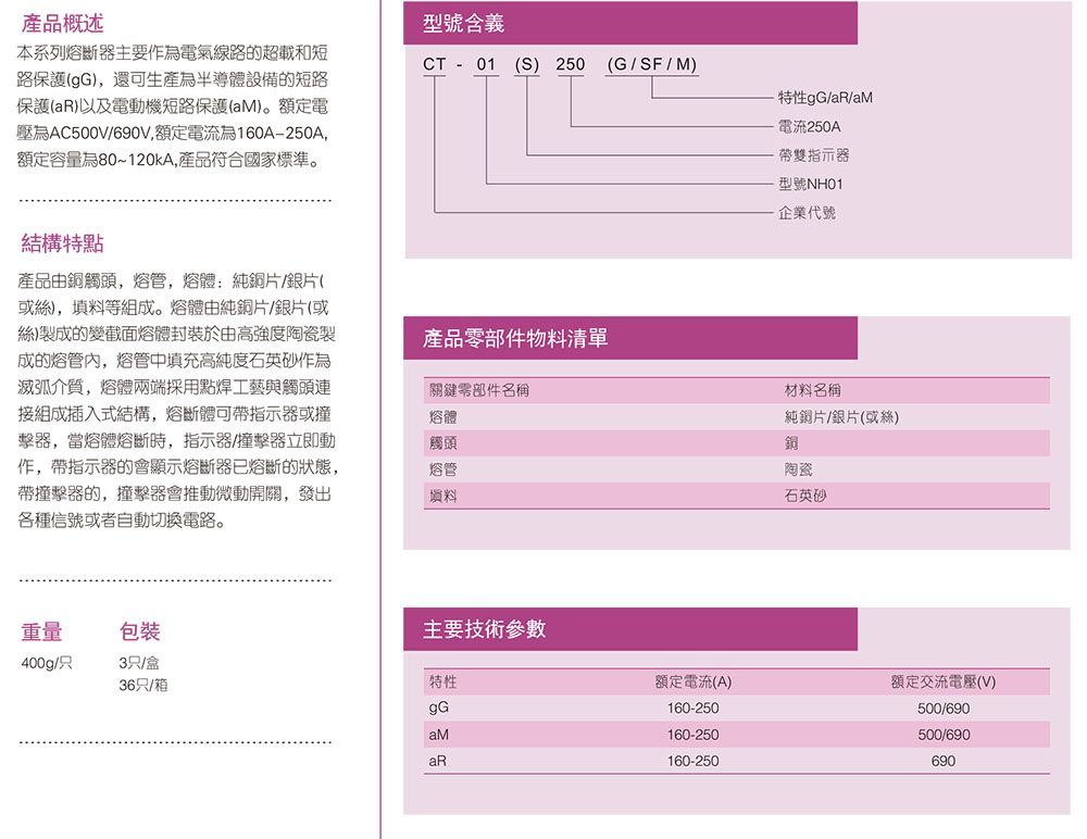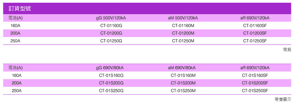 本系列熔斷器主要作為電氣線路的超載和短路保護(gG),還可生產為半導體設備的短路保護(aR)以及電動機短路保護(aM)。額定電壓為AC500V/690V,額定電流為160A-250A,額定容量為80~120kA,產品符合國家標準