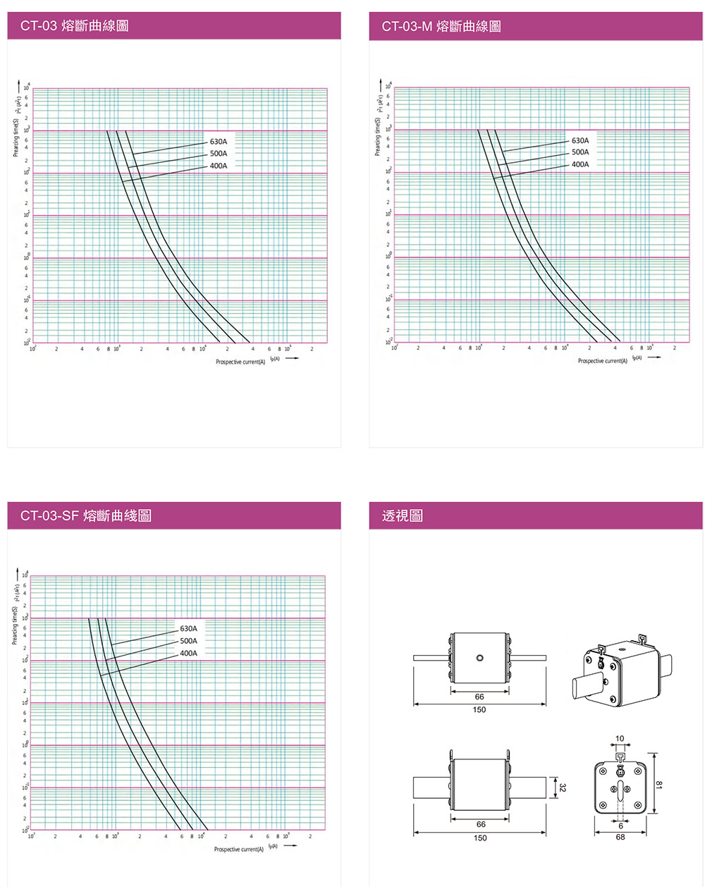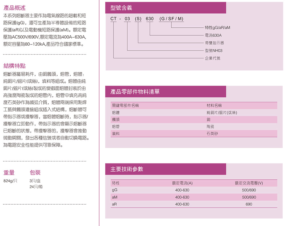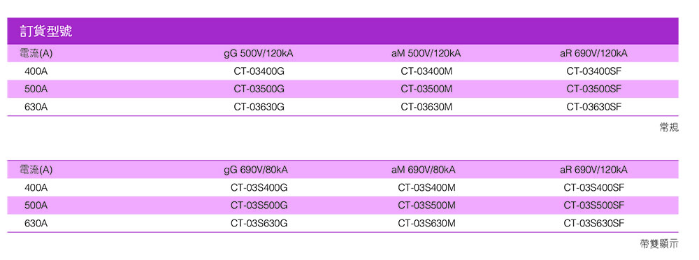 本系列熔斷器主要作為電氣線路的超載和短路保護(gG),還可生產為半導體設備的短路保護(aR)以及電動機短路保護(aM)。額定電壓為AC500V/690V,額定電流為400A-630A,額定容量為80~120kA,產品符合國家標準。