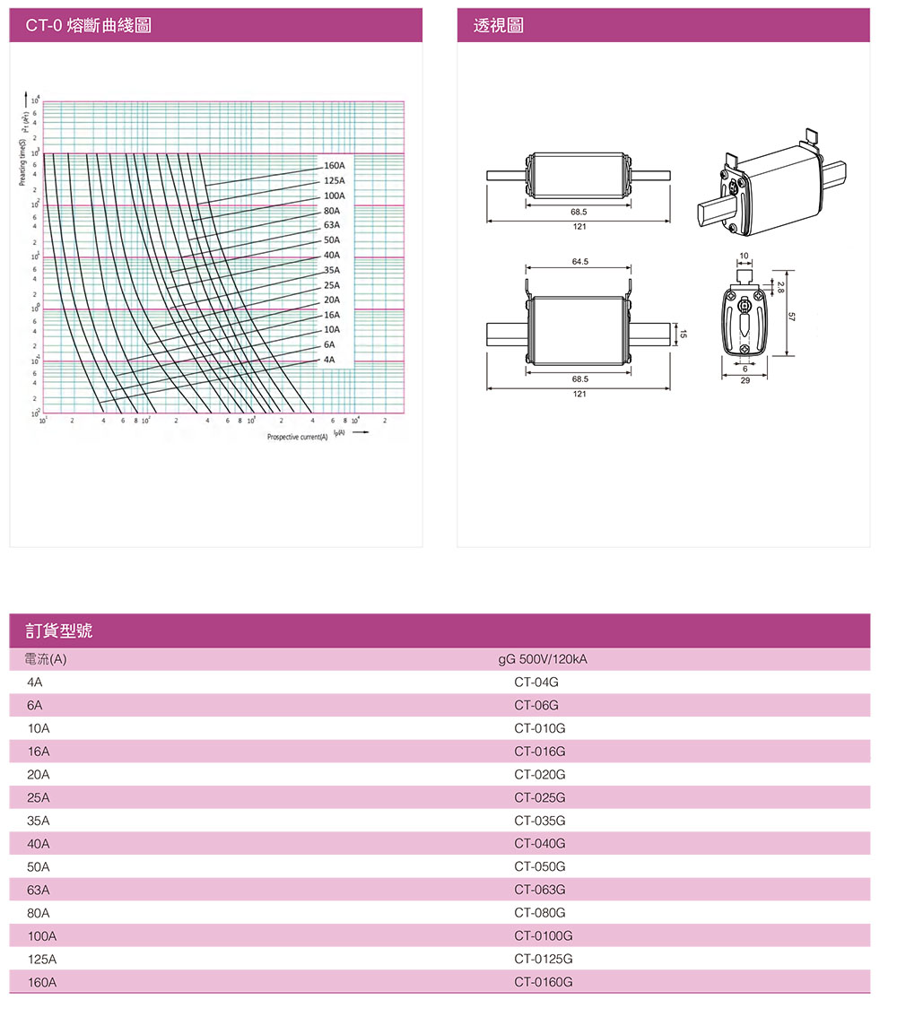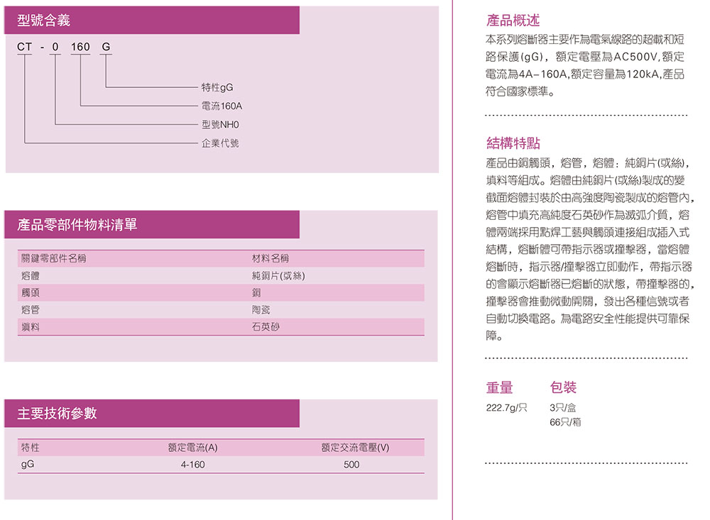 本系列熔斷器主要作為電氣線路的超載和短路保護(gG),額定電壓為AC500V,額定電流為4A-160A,額定容量為120kA,產品符合國家標準。