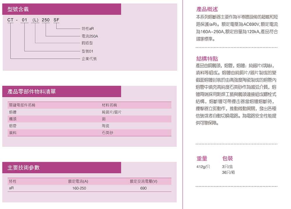 本系列熔斷器主要作為半導(dǎo)體設(shè)備的超載和短路保護(hù)(aR)。額定電壓為AC690V,額定電流為160A-250A,額定容量為120kA,產(chǎn)品符合國(guó)家標(biāo)準(zhǔn)