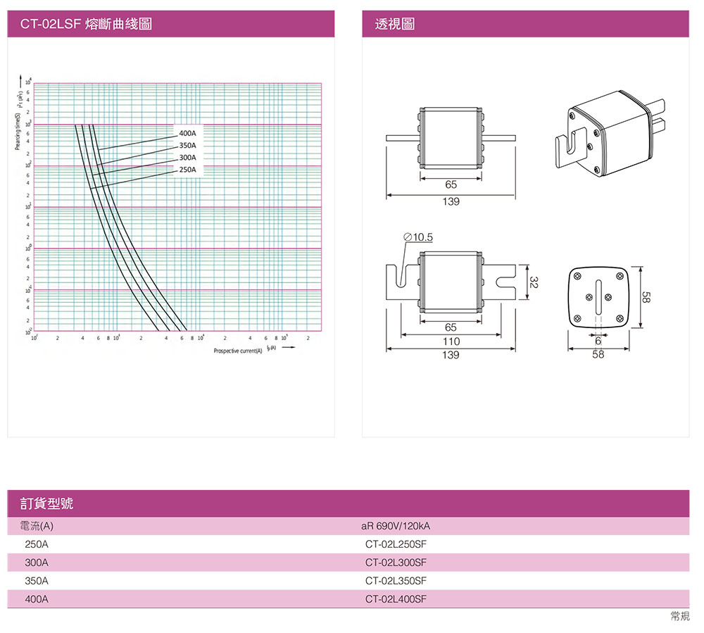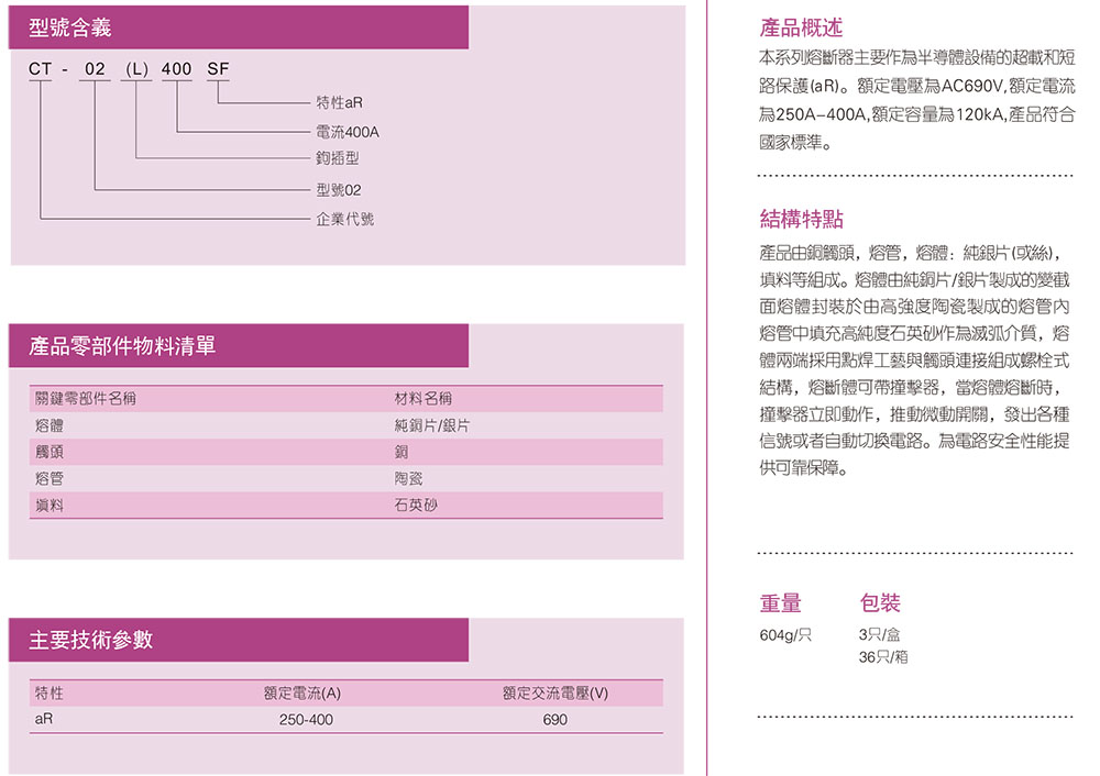 本系列熔斷器主要作為半導體設備的超載和短路保護(aR)。額定電壓為AC690V,額定電流為250A-400A,額定容量為120kA,產品符合國家標準
