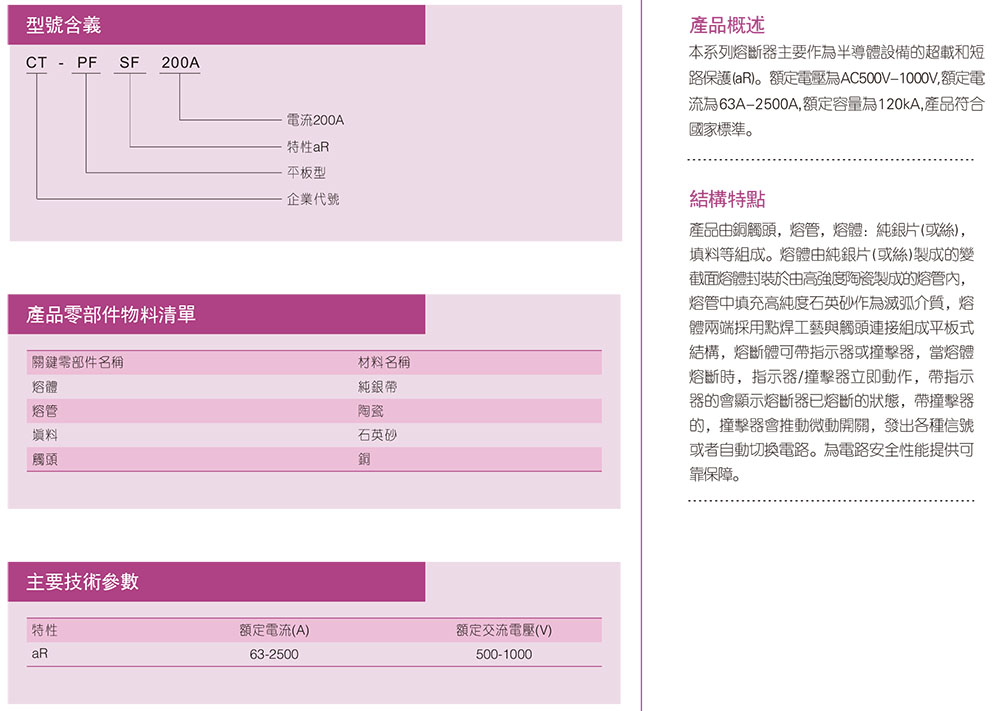 本系列熔斷器主要作為半導體設備的超載和短路保護(aR)。額定電壓為AC500V-1000V,額定電流為63A-2500A,額定容量為120kA,產品符合國家標準。